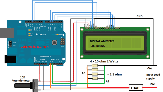 همان طور که مشاهده می شود در شکل بالا شماتیک و اتصالات مدار آمپرمتر با استفاده از آردوینو را مشاهده می کنید. اتصلات بسیار ساده هستند . ابتدا پتانسیومتر ۱۰ کیلویی را برای دست یابی به کنتراست مناسب ال سی دی تنظیم کنید. اتصالات را همانند بالا ببندید و سپس کد برنامه ی زیر را در آردوینو بریزید. توجه کنید که پلاریته ی تغذیه ی بار ورودی را عوض نکنید.